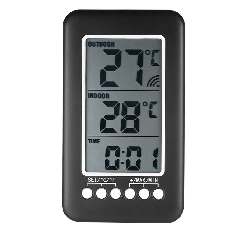 temperatura esterna. Specifiche: Materiale: ABS Colore: nero Display: display LCD 94 * 54 mm Intervallo di misurazione della temperatura interna: 0~50℃ / 32~122℉ Intervallo di temperatura esterna: -20~70℃ / -4~158℉ Precisione della temperatura: ±1℃ Periodo di rilevamento della temperatura interna: test una volta per 30 secondi Periodo di rilevamento della temperatura esterna: test una volta 57 secondi Funzione: visualizzazione dell'ora, temperatura interna/esterna, ℃/℉ commutabile, formato ora 12H/24H, trasmettitore separato Batteria del trasmettitore: 2 batterie AA da 1,5 V (non incluse) Alimentazione dell'orologio della temperatura: 2 batterie AAA da 1,5 V (non
