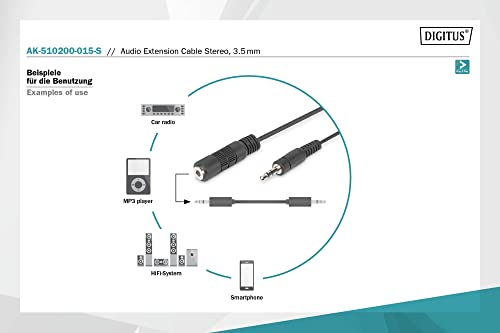 DIGITUS Cavo di prolunga Audio - da Jack 3,5 mm a Presa 3,5 mm - Cavo aux - Cavo Stereo - 1,5 m - Nero - per impianti Stereo, Home Cinema, soundbar, Computer