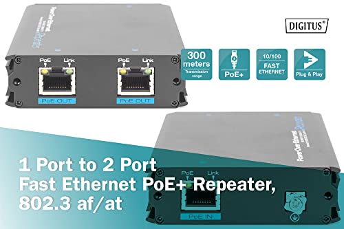 DIGITUS PoE+ Extender Switch - RJ45 Fast Ethernet - 1 porta di ingresso - 2 porte di uscita - Alimentazione tramite PoE, 100 MBit/s