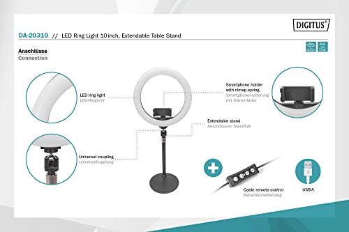 DIGITUS Luce anulare a LED - 10 pollici - dimmerabile - temperatura colore regolabile - telecomando via cavo - supporto da tavolo - supporto per smartphone - per streaming, podcasting, videoconferenze