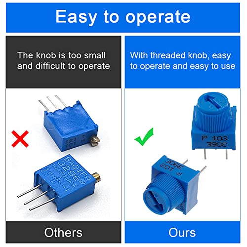 【Facile da usare】I potenziometri trimmer possono essere facilmente inseriti in breadboard o schede generiche per una facile installazione, soprattutto per progetti elettronici. I potenziometri rotativi possono essere utilizzati in una varietà di dispositivi elettronici, ad es. B. in strumenti, giocattoli elettronici, apparecchiature video, apparecchiature di informazione e comunicazione, apparecchiature radio, apparecchiature mediche, computer, ecc.