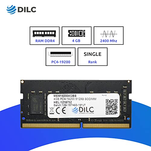 DILC, RAM DDR4 SODIMM 4GB, Memoria RAM per Pc Portatile, 2400Mhz, PC4-19200 (260 Pin), Single Rank, Compatibile con Computer Portatili/Notebook o Mini Pc con Slot SODIMM, Garantita a Vita, 512x8