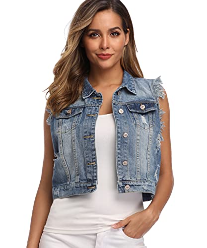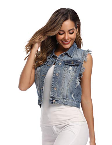 Dilgul Gilet Donna Gilet di jeans Panciotto Tasche Abbottonato Senza Maniche Denim Veste Strappato Giacca Azzurro Small