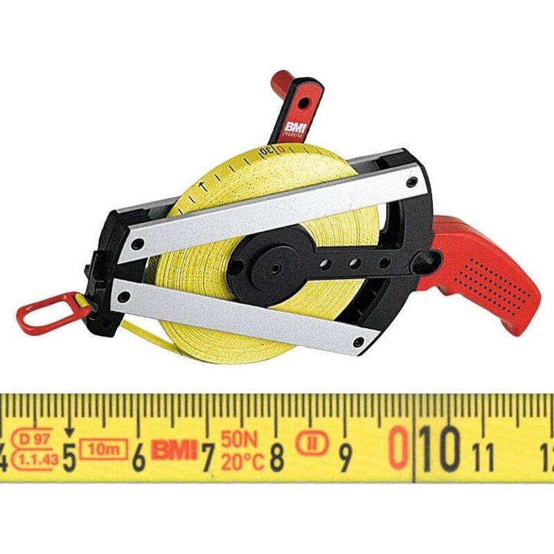 Dimensione a fascia in fibra di vetro (giallo) lunghezza = 30 m con divisione centimetri continui per determinare le distanze con l'accuratezza di CM nel telaio di recupero, le dimensioni della fascia in fibra ottica, il giallo in telaio di rollio in alluminio con manico in plastica resistente all'impatto da Il lato destro a sinistra per la sinistra destra e la mancia a sinistrable a due cuscinetti garantiscono un inizio di misurazione e rotolamento della misurazione dopo la fascia Flextop di circa 10 cm inizia dall'avvio del nastro nel telaio up-to-roll.