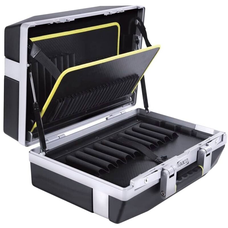 Caso di utensili Premium Ciotola del vestito fatto di plastica dell'ABS 1 scheda utensile con 19 scomparti a innesto sulla parte anteriore e un vano portadocumenti sul retro 1 scheda portautensili con 24 scomparti a innesto sulla parte anteriore e 14 vani plug-in sul retro 1 listello con 10 vani plug-in Coperture da pavimento con 5 inserti speciali rimovibili tipo 55 (A) Sistema di apertura con bombole di pressione gas per una facile apertura e chiusura sicura del coperchio Piedini robusti e grip comfort Telaio a pressione in alluminio con telaio addizionale per stabilizzare la valigia portando 35 kg di erogazione: con 2 serrature cilindro.Nota: adatto per il compito come un bagaglio di volo.