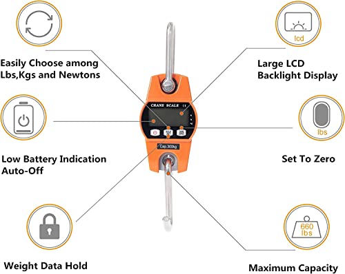 Dinamometro digitale o gancio pesatore per pesare merce sospesa fino ad una portata massima di 300 kg. Questo dinamometro ha una struttura in metallo particolarmente robusta ed é dotato di gancio superiore e gancio inferiore con chiusura di sicurezza. Funzione azzeramento, tara, cambio unità di misura ed ON/OFF. Il colore potrebbe differire da quello della foto.