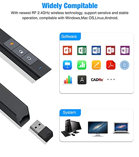 Il Prasentation Remote supporta Windows XP / 7/8/10/Mac OS/Linux. Il Presenter è compatibile con Powerpoint/Keynote/Prezi e così via. Uno strumento di presentazione perfetto per dottore, presentatori di eventi, insegnanti, scale di vendita e così via.