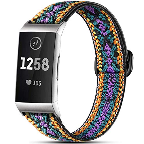 Dirrelo Elastico Nylon Cinturino Compatibile con Cinturino Fitbit Charge 3/ Cinturino Fitbit Charge 4, Regolabile Cinturino Morbido Tessuto Cinturino, Accessori Sportivi per Uomo Donna, Viola Azteco