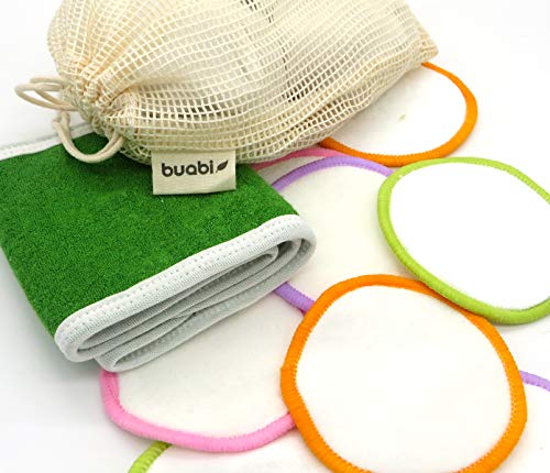 Il kit più completo: 8 dischetti multicolore in bambù (diametro 8 cm) + 4 dischetti in carbone di bambù (diametro 8 cm) + 2 salviette struccanti (15 x 15 cm) + fascia struccante + borsa per il lavaggio + bella scatola di bambù naturale per riporre le salviette.