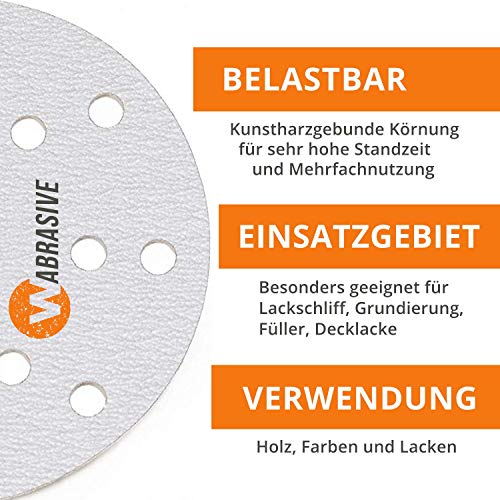 Resistente: la grana in resina sintetica o la superficie di carburo di silicio della nostra carta vetrata con velcro da 150 mm ha un elevato tempo di resistenza e, a seconda dell'utilizzo, può essere riutilizzata più volte.