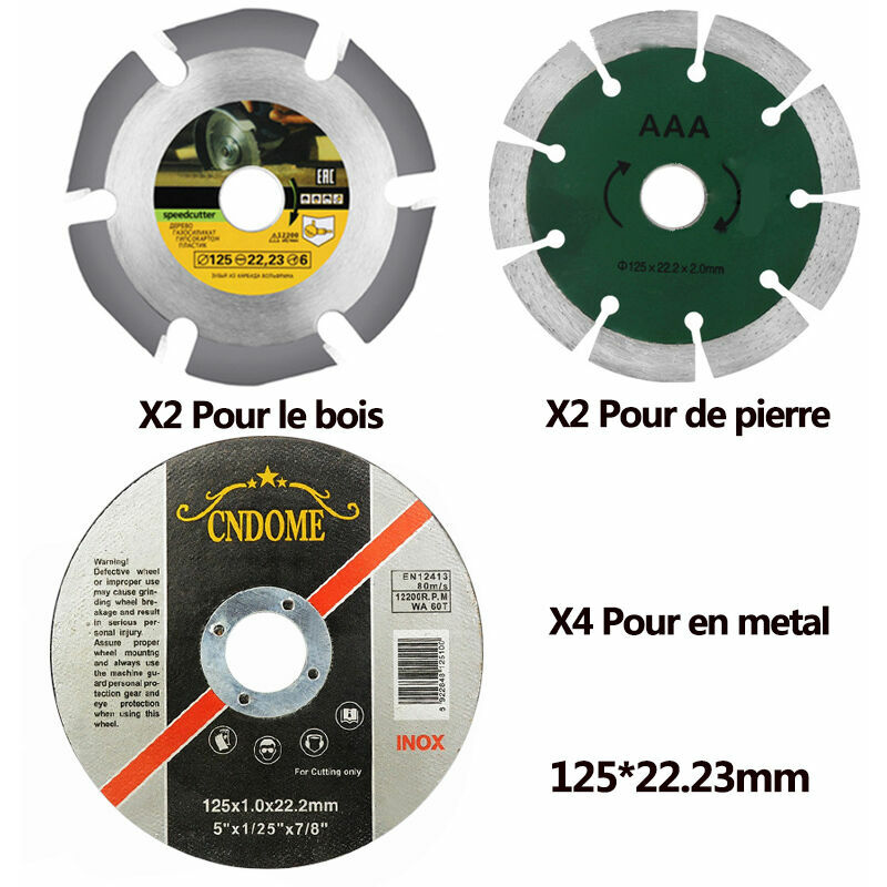 Materiale: diamante, lega dura, corindone bianco Dimensioni: 125 x 22,23 mm (5 x 7/8 pollici) Velocità massima: 12200 giri/min Materiali applicabili: pietra, legno, metallo Set di 8 lame da taglio premium con 3 tipi di lame da taglio: 2 lame da taglio per pietre, 2 lame da taglio per legno, 4 lame da taglio per metalli. Caratteristiche: Lama da taglio per pietre Progettato per cemento, piastrelle di ceramica, vetro, ceramica e altri materiali, con fori di dissipazione del calore per aiutare la macchina a dissipare il calore, migliorare la nitidezza e prolungarne la durata. Lama da taglio per legno Appositamente progettata per il legno il taglio, con 6 denti ad arco per evitare che la segatura si inceppi durante il processo di taglio, migliora l'affilatura, facile e sicuro. Lame da taglio per metalli Progettate per il taglio veloce di metalli e acciaio inossidabile. Design ultrasottile da 1 mm per un taglio veloce senza sbavature con una perdita di materiale minima, rende il progetto