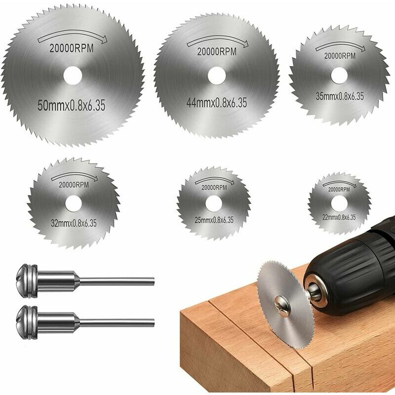 Disco da taglio mini utensile rotante da 6 pezzi - Accessori per utensili rotanti, lama per trapano a disco e 2 alberi mandrino Realizzato in acciaio ad alta velocità. Acciaio ad alta velocità: la temperatura di tempra è di circa 1205-1215 ° C, la durezza è di 61-66,2 HRC. La durezza extra e la resistenza all'usura prolungano la durata della lama della sega o della mini lama per sega circolare. La lama da taglio è adatta per tagliare legno, plastica, fibra, vetro, lega di alluminio, metallo morbido, ecc. < li>Dimensioni del disco perforato: 22 (25, 32, 35, 44, 50)*diametro 0,8*6,35;