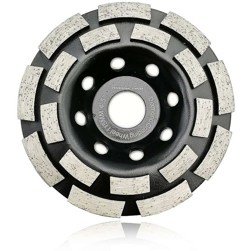 Design a doppia fila con 18 segmenti diamantati, per asta da 2,2 cm. 11,4 cm (diametro esterno 115 mm), spessore del corpo in acciaio per impieghi gravosi 3 mm e 4,5 mm d. Grana diamantata 40-50 per la molatura di calcestruzzo, muratura, granito, marmo, mattoni. Design a doppia fila per una rimozione rapida e aggressiva. Il robusto corpo in acciaio offre prestazioni di taglio stabili e una buona fattura a un costo inferiore. Dimensioni: circa 157 * 200 * 20 mm Quantità: 1 pezzo Colore: come mostrato nell'immagine