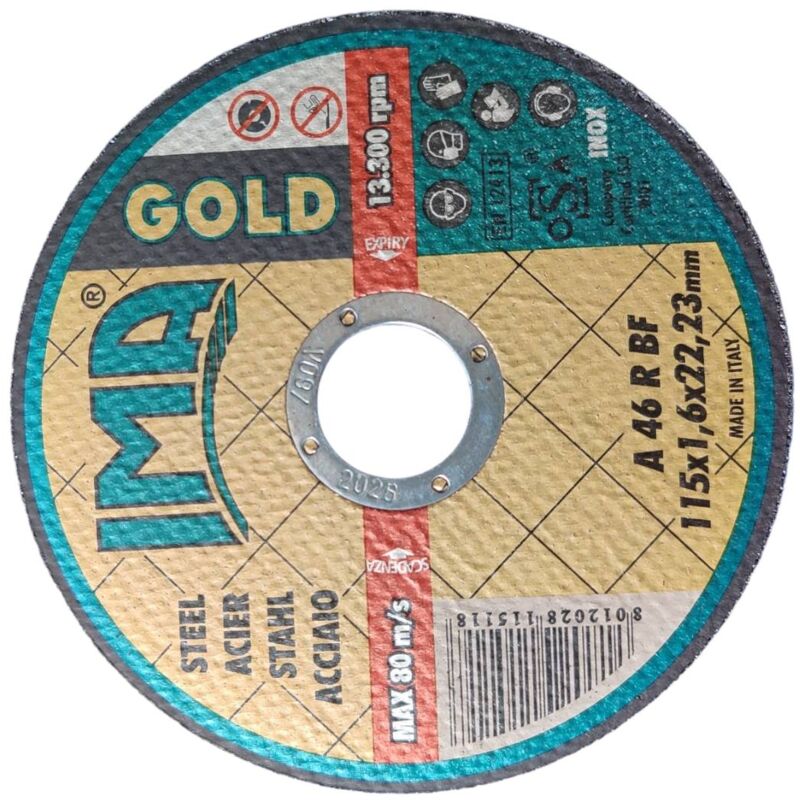 IMA - 6 dischi - Dimensioni Ø115x1,6x22,23 mm - Taglio Acciaio - Max 80 m/s - 13300 min - Certificazione EN12413 6 dischi. Disco abrasivo progettato per smerigliatrici, ideale per tagliare il Acciaio con precisione ed affidabilità. Con dimensioni di Ø115x1,6x22,23 mm, questo disco è perfetto per una varietà di applicazioni industriali e fai da te. Con una velocità max di 80m/s e 13300 giri/min, garantisce prestazioni ottimali e una lunga durata. Affronta i tuoi progetti di lavorazione del metallo con fiducia grazie a questo disco abrasivo di alta qualità.