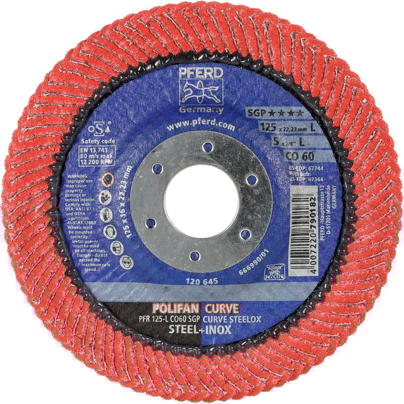 Disco abrasivo lamellare per la lavorazione di saldature d'angolo. La forma radiale con disposizione speciale delle lamelle permette di sfruttare in modo ottimale il materiale abrasivo nel raggio. Capacità di asportazione, durata e stabilità della forma elevate. SGP CURVE STEELOX (CER) in grana 60 per superfici fini e lavorazione a freddo su materiali a bassa termoconduttività. Uso: Molatura precisa di geometrie di saldature d'angolo, smussi e sbavature. Esecuzione larga (L) per saldature d'angolo > 8 mm. Dati tecnici Acciaio < 67 HRC m/s idoneo Acciaio < 900 N/mm² m/s idoneo CuZn m/s limitatamente adatto Al/Mg m/s limitatamente adatto Acciaio < 55 HRC m/s idoneo Acciaio < 60 HRC m/s idoneo a secco idoneo Ti m/s idoneo INOX m/s idoneo Acciaio < 1400 N/mm² m/s idoneo GG(G) m/s limitatamente adatto Ottimizzato per il materiale INOX Sigla materiale abrasivo Ceramica Percentuale di ferro, zolfo e cloro % < 0,1 Velocità periferica massima m/s 80 Tipo di prodotto Disco abrasivo lamellare ⌀
