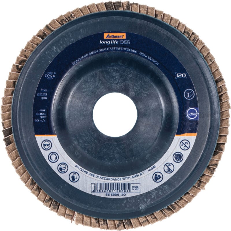 DescrizioneEsecuzione:Grana ceramica autoaffilante (CER) di alta qualità per il massimo potere abrasivo e una minima pressione di contatto.Rivestimento abrasivo per la lavorazione a freddo.Robusto tessuto misto poliestere-cotone per garantire un livello di usura ideale e una maggiore stabilità nell'impiego sui bordi.Platorello ergonomico in plastica e poliestere con sistema antivibrazioni (retrattile).Massimi risultati con smerigliatrici angolari potenti.long life - disposizione estremamente compatta delle lamelle per la massima durata.Uso:Per qualsiasi lavoro di rettifica, lavorazione in piano, asportazione e lavorazione di bordi.Dati tecnici Materiale abrasivo Grana ceramica (CER) Sigla materiale abrasivo Ceramica Grana 120 rivestimento abrasivo di raffreddamento si Percentuale di ferro, zolfo e cloro < 0,1 % Descrizione della forma inclinato ⌀ disco 115 mm ⌀ foro 22,23 mm ottimizzato per il materiale INOX Velocità periferica max. 80 m/s Tipo di prodotto Disco abrasivo lamellare