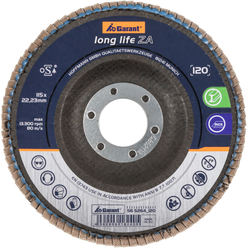 Acciaio Velocità periferica max. 80 m/s Tipo di prodotto Disco abrasivo lamellare Codice articolo 565264 120 EAN / GTIN 4062406162405