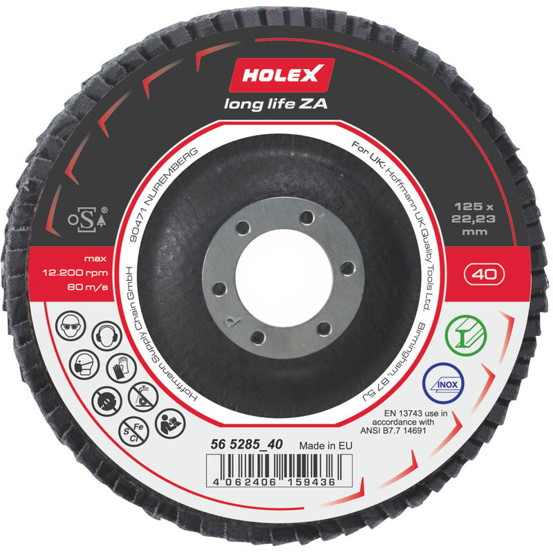 Acciaio Velocità periferica max. 80 m/s Tipo di prodotto Disco abrasivo lamellare Codice articolo 565285 40 EAN / GTIN 4062406159436
