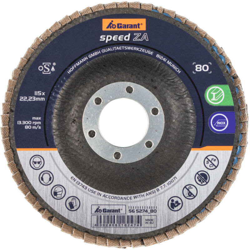 DescrizioneEsecuzione:Corindone in zirconio (ZA) di qualità premium per la massima potenza abrasiva.Robusto tessuto misto poliestere-cotone per garantire un livello ideale di usura e una maggiore stabilità nell'impiego sui bordi.Robusto platorello in fibra di vetro per una pressione di contatto ottimale.Per l'impiego universale su acciaio e INOX.Massimi risultati con smerigliatrici angolari di tutte le classi di potenza.speed - disposizione in piano delle lamelle per un alto volume di asportazione del truciolo e una durata elevata.Uso:Smussatura precisa, lavorazione di bordi e lavorazione in piano.Dati tecnici Materiale abrasivo Zirconio (ZA) Sigla materiale abrasivo ZA Grana 80 Percentuale di ferro, zolfo e cloro < 0,1 % Descrizione della forma piatto ⌀ disco 115 mm ⌀ foro 22,23 mm ottimizzato per il materiale INOX;