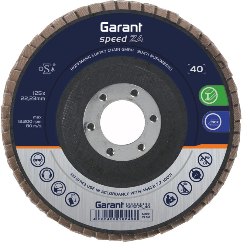 DescrizioneEsecuzione:Corindone in zirconio (ZA) di qualità premium per la massima potenza abrasiva.Robusto tessuto misto poliestere-cotone per garantire un livello ideale di usura e una maggiore stabilità nell'impiego sui bordi.Robusto platorello in fibra di vetro per una pressione di contatto ottimale.Per l'impiego universale su acciaio e INOX.Massimi risultati con smerigliatrici angolari di tutte le classi di potenza.speed - disposizione in piano delle lamelle per un alto volume di asportazione del truciolo e una durata elevata.Uso:Smussatura precisa, lavorazione di bordi e lavorazione in piano.Dati tecnici Materiale abrasivo Zirconio (ZA) Sigla materiale abrasivo ZA Grana 60 Percentuale di ferro, zolfo e cloro < 0,1 % Descrizione della forma piatto ⌀ disco 125 mm ⌀ foro 22,23 mm ottimizzato per il materiale INOX;
