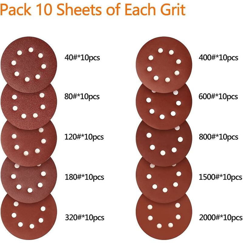 Tipo completo: inclusi 100 dischi abrasivi di diverse dimensioni di grana: 40/80/120/180/320/600/800/1000/1500/2000, 10 di ogni tipo. Risponde quasi a tutti i requisiti di lucidaturaAlta qualità: disco abrasivo con base di carta di qualità spessa D, allumina di alta qualità con usura della sabbia resistente alle intemperie, sistema di connessione a;
