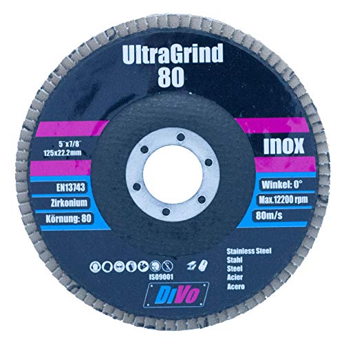 Disco abrasivo UltraGrind 80 (platorello abrasivo, zirconio, EN 13743, grana 80, acciaio e acciaio inox, angolo 0°, fibra di vetro, 125 mm x 22)
