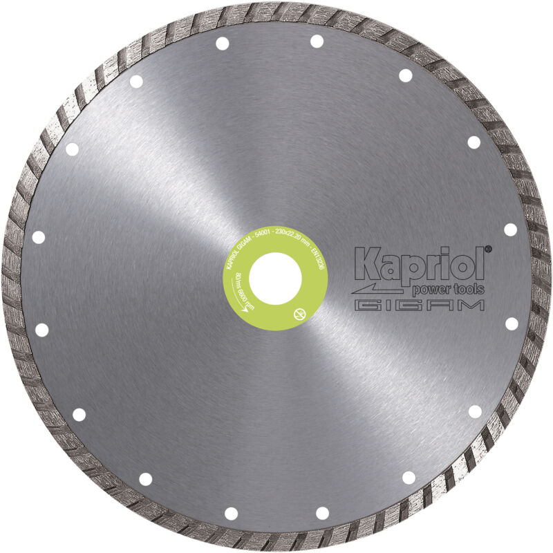 Mod. 54116 disco sinterizzato a corona continua turbo ideale per il taglio di cemento armato, granito, marmo. Altezza corona 10 mm. Foro 22,2 mm. Diametro 230 mm.