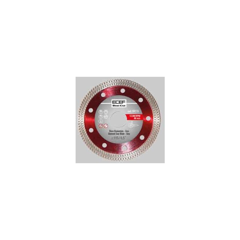 Disco diamantato per taglio gres porcellanato, klinker, travertino cotto, ceramica dura, piastrelle, marmo. Diamantatura continua. Idoneo al taglio con e senz'acqua. Foro mm 22,23. Disco diamantato per gres 'turbo' ø 115x1,3 mm ECEF Dischi diamantati