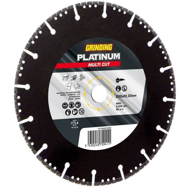 Mod. PLATINUM MULTI CUT disco multiapplicazione. Speciale trattamento galvanico sottovuoto ideale per per taglio di tutti i materiali. Diamante elettrodepositato. Corona con asole di sfogo. Taglio rapido e lunga durata. Per il taglio di materiali da costruzione, ghisa, ferro, cemento, PVC, vetroresina, legno. Foro 22,2 mm. Spessore 3,1 mm. Dimensioni 230 mm.