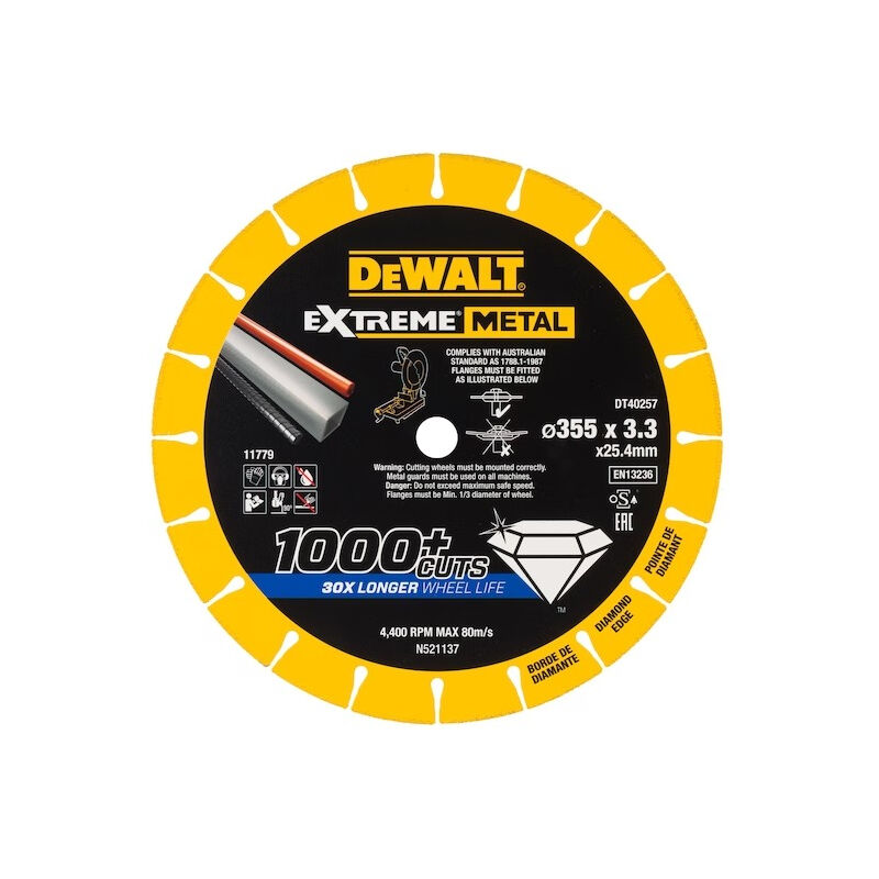 Dettagli: I dischi diamantati EXTREME METAL consentono oltre 1.000 tagli, ovvero una durata circa 30 volte superiore a quella di un disco abrasivo standard. Oltre 1.000 tagli: Lama Extreme Diamond Edge composta da diamanti da taglio metallici incollati alla superficie del disco grazie a una tecnologia esclusiva. Maggiore sicurezza: la lama Extreme Diamond Edge è realizzata in acciaio massiccio, riducendo significativamente il rischio di rottura. Nessuna scadenza: a differenza dei dischi abrasivi incollati, il disco Extreme Diamond Edge non ha una data di scadenza, purché sia conservato nelle giuste condizioni. Conservazione del diametro: poiché il suo bordo diamantato non si usura, il disco Extreme Diamond Edge mantiene il suo diametro originale fino all'ultimo taglio. Meno polvere, spazio di lavoro più salubre: poiché il disco Extreme Diamond Edge non si usura, si ottiene una significativa riduzione delle particelle sospese nell'aria. Un disco - molti metalli: il disco Extreme