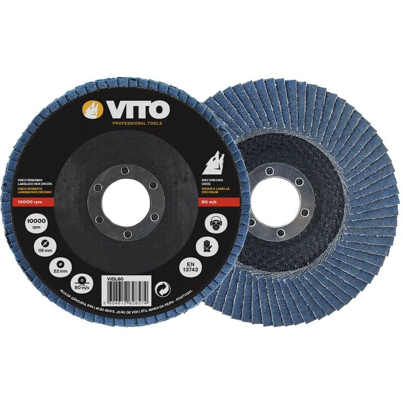 Disco lamellare in zirconio VITOPOWER con diametro di 115 mm e foro di 22 mm. Una granulometria di 100. 80 m/s