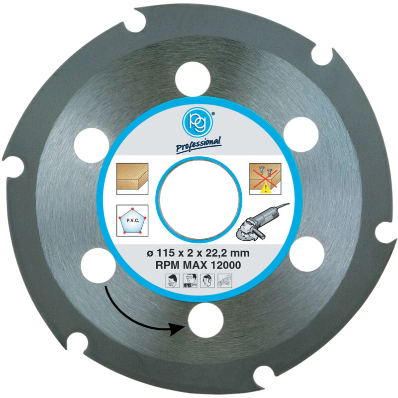 DISCO PER TAGLIO LEGNO CON SMERIGLIATRICE PG 419.90 MM.115 Per fresare, tagliare e smussare il legno e lavorare PVC e altri materiali plastici. Utilizzare sempre l'impugnatura supplementare laterale e il carter di protezione, rispettando il senso di rotazione indicato sulla lama.DISCO PER TAGLIO LEGNO PG 419.90 MM.115x2 di spessore. Ideale per tagliare, smussare, fresare il legno e la plastica in genere, utilizzando una comune smerigliatrice angolare. Indicato per falegnami, installatori, artigiani e per tutti gli utilizzi professionali.Diametro foro mm. 22. Avvertenze per l' utilizzatore: Utilizzare sempre l' impugnatura supplementare ed il carter di protezione.Rispettare il senso di rotazione indicato sulla lama. Non utilizzarlo in caso di presenza di chiodi sul materiale da tagliare
