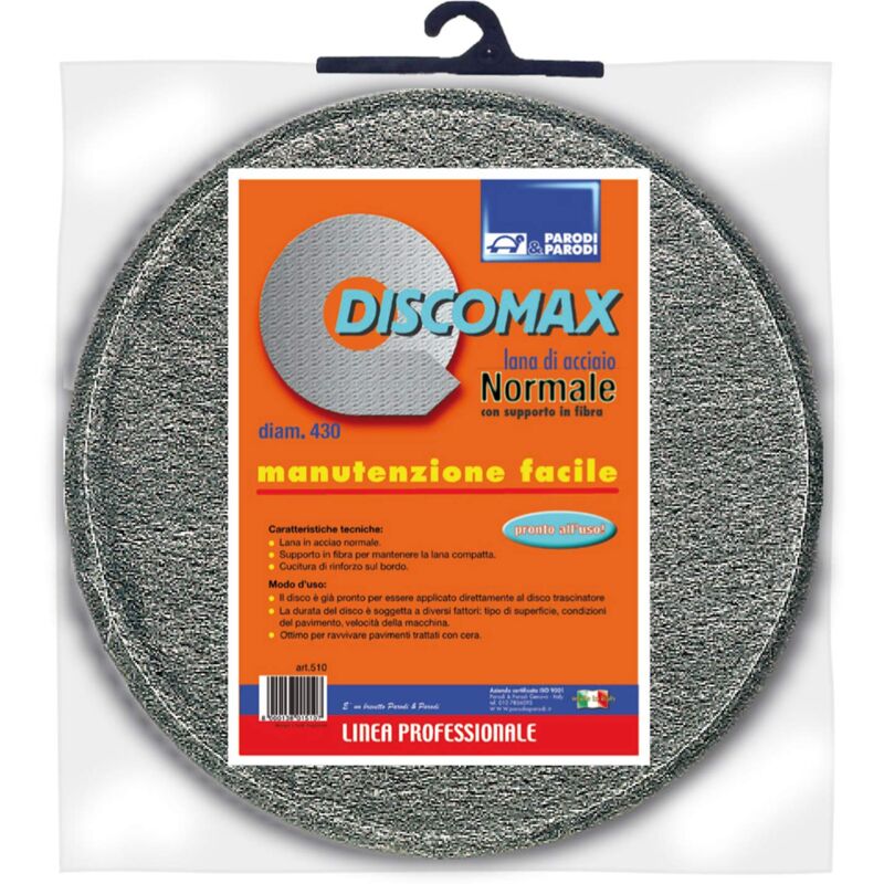 Disco per lucidatrice DISCOMAX, disco per pavimenti in acciaio con supporto,disco in lana di acciaio diametro 430mm pronto per essere applicato al disco trascinatore,ideale per manutenzione ordinaria. DISCOMAX, disco in lana di acciaio diam. 430mm pronto per essere applicato al disco trascinatore, 100% made in Italy. DISCOMAX in lana di acciaio. La durata del disco è soggetta a diversi fattori: tipo di superficie, condizioni del pavimento, tipo di acido cristallizzante, velocità della macchina. Disco per pavimenti con supporto in fibra per mantenere la lana compatta. disco in lana di acciaio diam. 430mm con cucitura di rinforzo sul bordo, pronto per essere applicato al disco trascinatore. Ideale per ordinaria manutenzione. Ottimo per ravvivare pavimenti con cera. Il disco è già pronto per essere applicato direttamente al disco trascinatore. Il supporto dà più compatezza alla lana di acciaio e pertanto la polvere di lana dʼacciaio si riduce al minimo