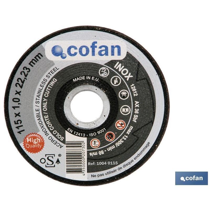 Dischi da taglio professionali (acciaio/inox) per smerigliatrice angolare. CEE (EN 12413), FEPA. Certificata secondo la norma uni ISO 9001:2000. oSa (Organizzazione per la Sicurezza degli Abrasivi) Spessori da 1 mm nel diametro 115 mm e da 1,9 mm nel d