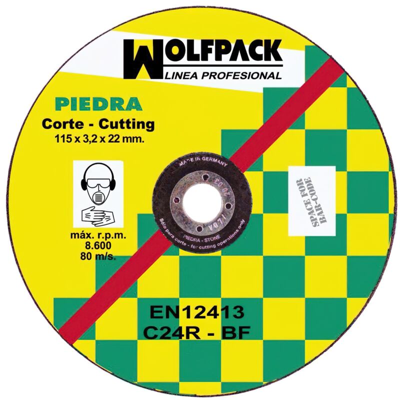 Disco in pietra Wolfpack. - Misure: > diametro disco 115 mm. > diametro anello interno 22 mm. > spessore disco 3,2 mm. - Struttura interna in rete di fibra di vetro per una maggiore resistenza e durata. - Anello interno più spesso per un migliore fissaggio alla macchina. - Materie prime della migliore qualità per un uso professionale e duraturo. - Prodotto di massima qualità e affidabilità. - Articolo noto anche come: dischi da taglio abrasivi.
