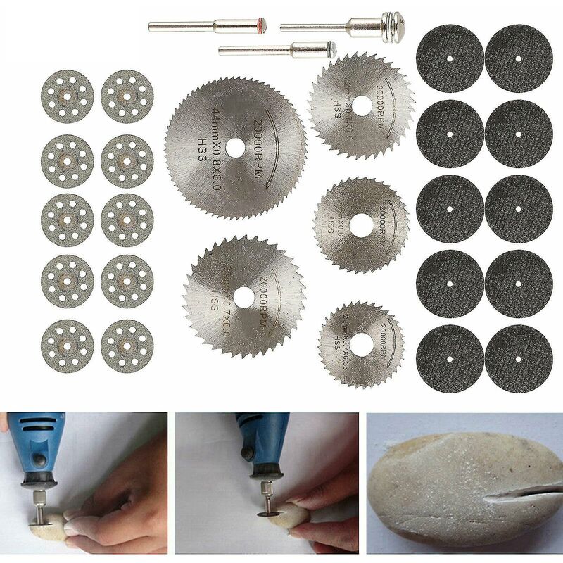 30Pcs Set di dischi per seghe a disco per seghe a disco per mini trapano Accessori per utensili rotanti Dremel con dischi per lame per seghe a disco per taglio a mandrino Caratteristiche: Dischi per lame per seghe circolari mini HSS: dischi per lame per seghe a disco circolari in 5 dimensioni (0,88 / 1/ 1.26/ 1.39/ 1.74) per il taglio di legno e plastica, modifica di case, circuiti stampati e produzione fai-da-te. Superficie di taglio liscia e di alta precisione Dischi Dischi da taglio diamantati: adatti per il taglio di pietre, come pietre preziose, vetro, ceramica, porcellana, piastrelle, rocce Taglio di materiale affilato, ad alta densità, invariante e non bruciante Ampia gamma di utilizzo e lunga durata Dischi da taglio in resina: rinforzati con fibra di vetro per una maggiore durata.Lame per sega circolare da taglio Dischi perfetti per il taglio di metalli tra cui acciaio temprato, ferro, alluminio.Piccola fessura, alta precisione, alta resistenza, efficienza di lavoro