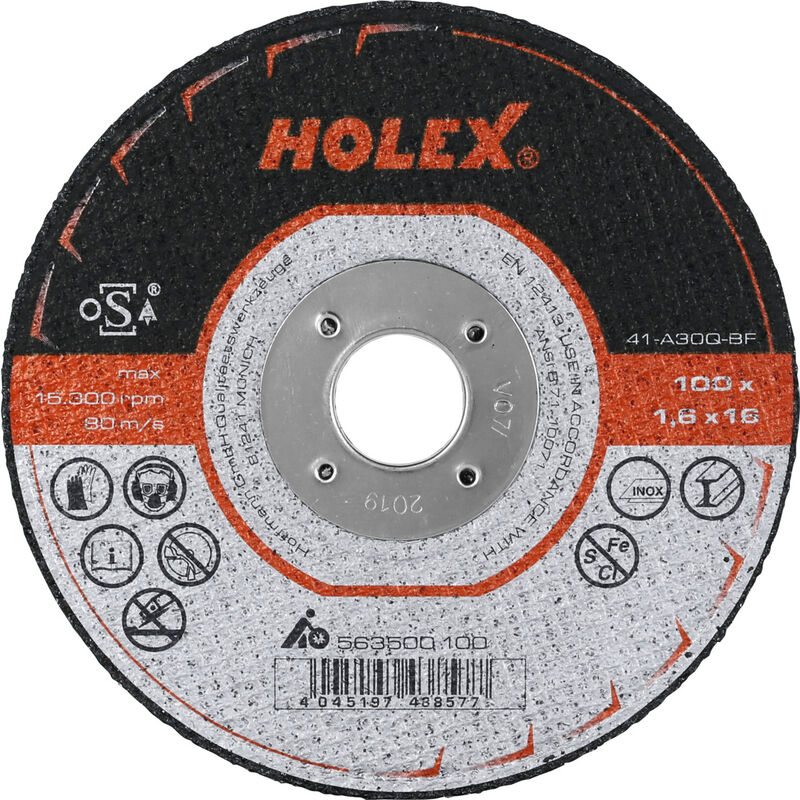 Disco per troncatura universale per acciaio e INOX, molto tagliente e stabile. ⌀ Foro 16 mm. Uso: Per la troncatura a mano su smerigliatrici angolari elettriche e ad aria compressa con velocità di taglio vc di 80 m/s. Specifica: A30Q-BF. Nota: Lo spessore dei dischi deve essere pari ad almeno il 20% dello spessore del materiale da troncare. Dati tecnici Acciaio < 55 HRC m/s idoneo a secco idoneo GG(G) m/s limitatamente adatto Acciaio < 1400 N/mm² m/s idoneo Acciaio < 900 N/mm² m/s idoneo INOX m/s limitatamente adatto Acciaio < 67 HRC m/s limitatamente adatto Ti m/s limitatamente adatto Acciaio < 60 HRC m/s idoneo Sigla materiale abrasivo A Velocità periferica massima m/s 80 Angolo di registrazione consigliato Grad 90 Percentuale di ferro, zolfo e cloro % < 0,1 Tipo di prodotto Disco per troncatura ⌀ Foro, mm 16 Numero massimo giri, min-1 15.300 Specifica A30Q-BF Larghezza disco, mm 1,6 Per spessori materiale, mm 7,7 della forma diritto Forma 41 ⌀ Disco, mm 100