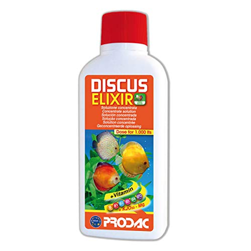 DISCUS ELIXIR Ƞuna soluzione concentrata di iodio, magnesio e vitamine del complesso B (B1, B2, B6, B12) che stimola la vitalità, l'appetito e la riproduzione dei Discus e di tutti gli altri pesci tropicali d'acqua dolce e ne accentua il colore naturale.