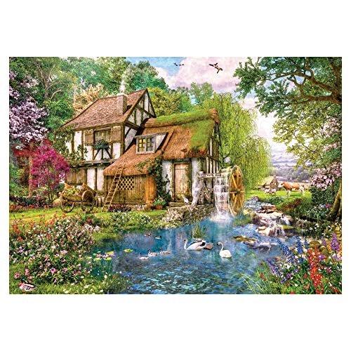Una bella illustrazione di un pittoresco cottage di mulino ad acqua e dei pittoreschi dintorni che pullulano di piante locali e fauna selvatica