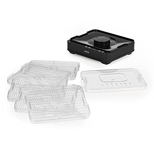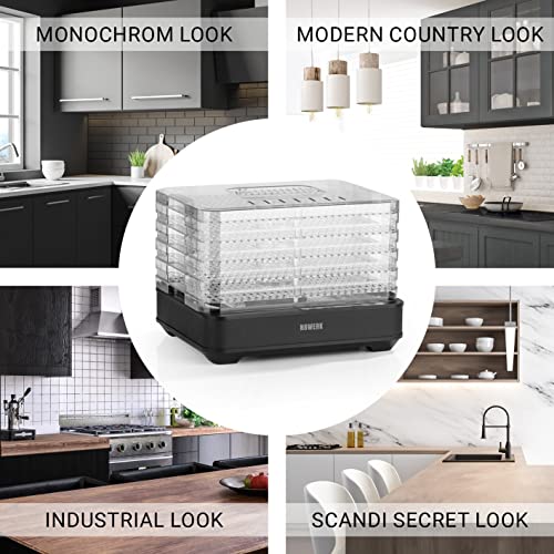 5 griglie di essiccazione regolabili in modo variabile: l'altezza delle griglie di essiccazione nel disidratatore può essere regolata in modo variabile. Questo significa che anche il cibo secco piatto può essere preparato rapidamente e facilmente. Per oggetti più grandi, basta cambiare i distanziatori.