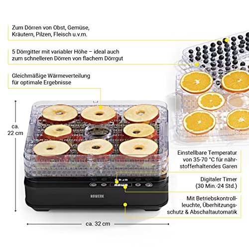 Disidratatore N8WERK | Controllo della temperatura da 35-70 °C | Timer (fino a 24 ore) | Disidratatore con 5 griglie| Altezza regolabile | Cottura conservativa di frutta e verdura