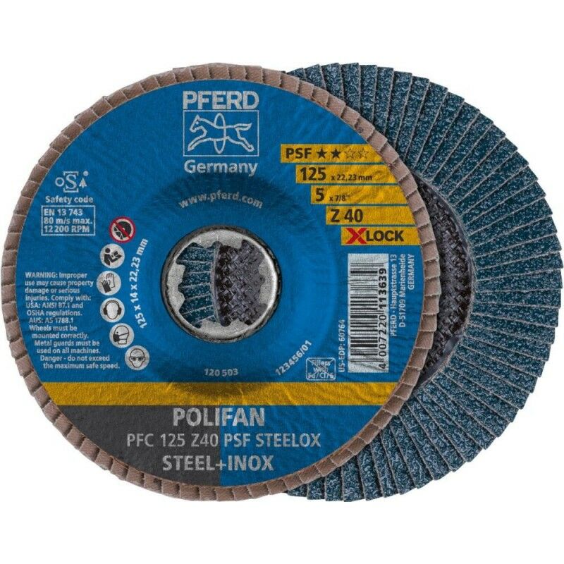 PFERD POLIFAN - Disco a ventaglio PFC 115 Z60 PSF STEELOX/X-LOCK // con il sistema Bosch X-Lock per smerigliatrice angolare è possibile cambiare gli strumenti in modo rapido e comodo. Invece di un foro rotondo, il sistema X-Lock presenta un profilo a X che permette di fissare lo strumento alla smerigliatrice angolare. Questo garantisce un serraggio sicuro di diversi strumenti in pochissimo tempo. L'esclusivo sistema soddisfa i più alti standard di qualità e sicurezza, e resiste anche a condizioni di utilizzo difficili e difficili. // Diametro: 115 mm // Grana: 60 // Versione: conica, PFC // Levigatore: zircone corindone Z // Foro: X-Lock (22,23 mm) // Attrezzi compatibili: smerigliatrice angolare, smerigliatrice angolare a batteria // Velocità massima: 13.300 RPM // Materiali lavorabili: acciaio, acciaio inox (INOX) // Lavori di lavorazione: taglio superficiale, saldatura saldatura, sbavatura e sbavatura // Consigli d'uso: Posizionare lo strumento sul sistema di serraggio X-Lock della