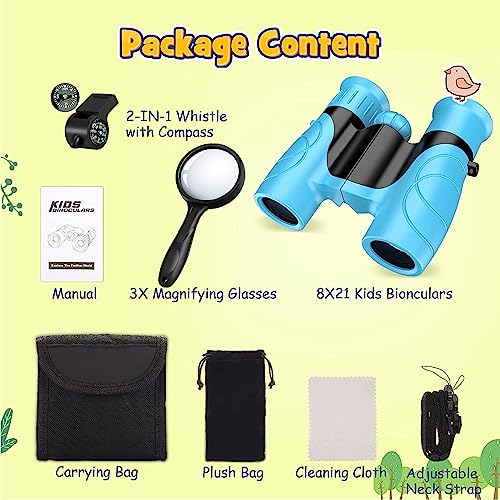 【KIT ESPLORATORE BAMBINI】Contenuto della confezione: binocolo 8X21, lente d'ingrandimento 3X, fischietto 2-IN-1 con bussola, custodia da cintura, borsa di peluche, panno in microfibra, tracolla, manuale. Sbrigati e lascia che i bambini li portino in un'avventura gratuita!