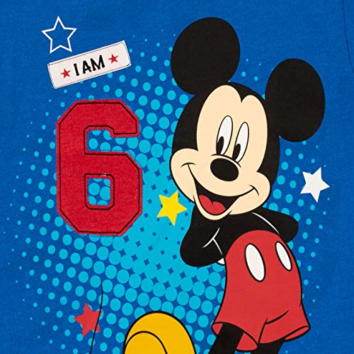 Un classico top Disney a maniche corte blu con Topolino circondato da stelle con le parole "I Am" ricamate e il numero "6" in feltro divertente