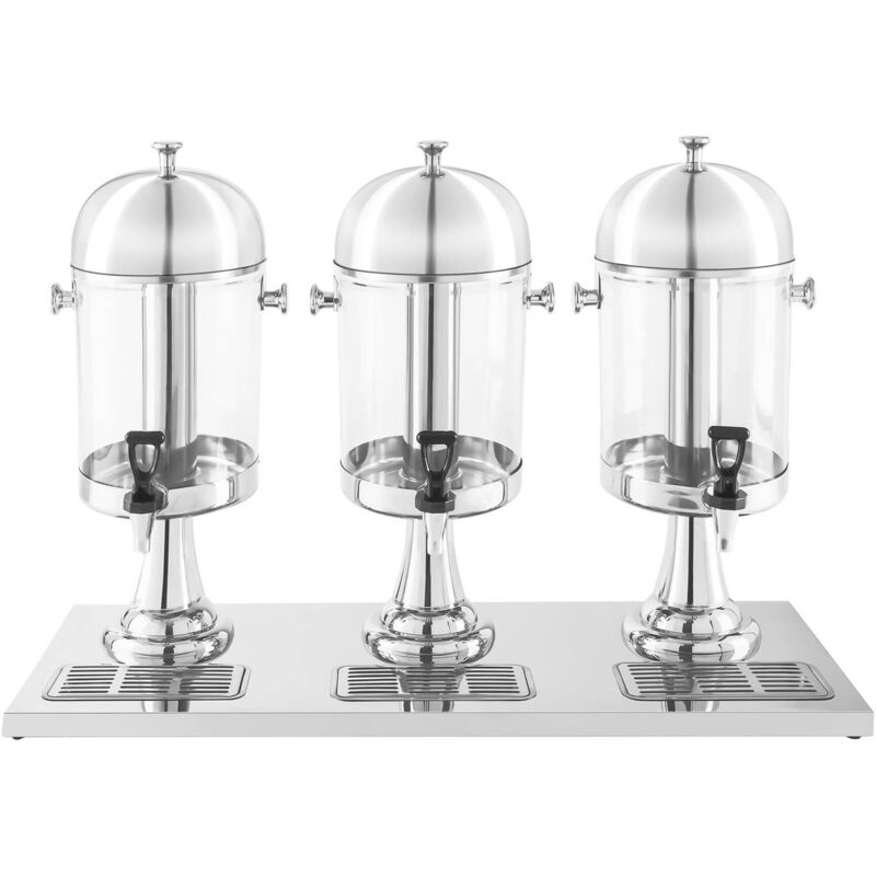 Dispenser per bevande 3 x 7 Litri Nell'ambito del settore alberghiero e della ristorazione il dispenser per bevande RCSD-3 del marchio Royal Catering rappresenta un must per ogni colazione a buffet che si rispetti. Grazie a questo incredibile prodotto potrai servire ai tuoi clienti bevande fresche e dall'aspetto gradevole, come spremute, tè o altri simili drink analcolici. Le vaschette raccogligocce integrate possono essere facilmente rimosse e svuotate. Ciò permette di mantenere il piano su cui poggia il dispenser sempre pulito e in ordine. I tre capienti dosatori da 7 Litri ciascuno consentono di riempire circa 105 bicchieri alla volta. L'erogazione alla spina delle bevande avviene mediante un pratico rubinetto. Questo articolo è compatibile con bicchieri alti fino a 14,5 cm. Inoltre, il dispenser RCSD-3 è dotato di cilindri per il ghiaccio che mantengono le bevande più a lungo fredde. A seconda delle proprie preferenze, questi cilindri possono essere o meno inseriti e adoperati.
