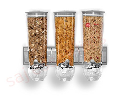 Dispenser di cereali e alimenti secchi, triplo, montato a parete, con vassoio per le briciole integrato, ideale per casa, cucina, bancone, colazione, animali, cibo per gatti, cibo per cani, caramelle, dispensa e pasti Silver