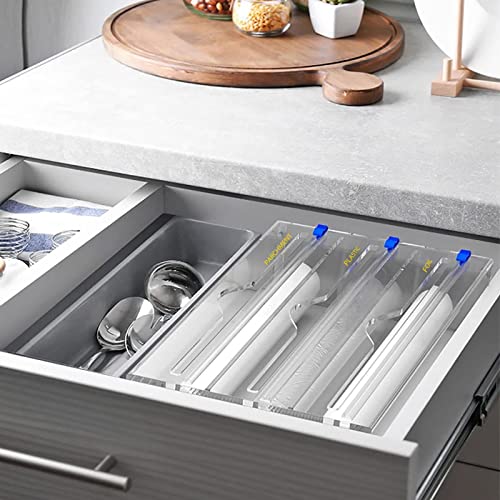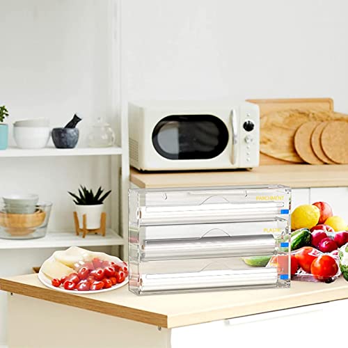 Dispenser di Fogli di Alluminio acrilici 3 in 1 con taglierina per Diapositive, Organizer Trasparente per cassetti da Cucina e Dispenser per Fogli di Alluminio, Carta Cerata e Carta Cerata