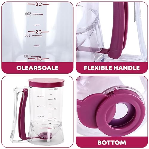 Il dispenser per pastelle per cupcake è realizzato in materiale alimentare di alta qualità, è facile da usare, progettato con un'ampia apertura a bocca che lo rende un gioco da ragazzi, grande spazio contenitore da 900 ml che può contenere ordinatamente la giusta quantità di pastella e la valvola a chiusura rapida rende versare il pancake perfetto come un professionista sembra un gioco da ragazzi. Basta posizionare la pastella completamente miscelata nel dispenser e tirare la maniglia fino a quando la miscela di dimensioni desiderate non viene versata nella padella.