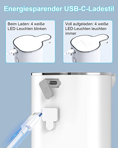 【Ricarica rapida USB】Il dispenser di sapone può essere ricaricato completamente in 2 ore con il cavo USB Type-C (incluso) e può essere utilizzato per più di 60 giorni quando è completamente carico. La lunghissima durata della batteria è un vantaggio pratico, che consente di risparmiare il costo e il fastidio di cambiare le batterie.