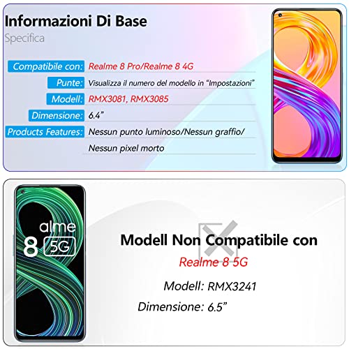 Lo schermo del display è per 6.4" Realme 8 Pro RMX3081 / Realme 8 4G RMX3085(Non per Realme 8 5G,Non Supporta L'impronta Digitale).Assicurarsi che il modello del telefono prima dell'acquisto.